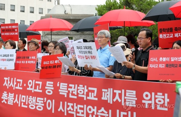 4일 특권학교 폐지 촛불시민행동은 서울시교육청 앞에서 기자회견을 열고 “외고·자사고·국제고 등 특권학교는 반드시 청산해야 할 대표적 교육 적폐”라고 주장하며 해당 학교들의 폐지를 위해 다양한 운동을 전개하겠다고 밝혔다.
