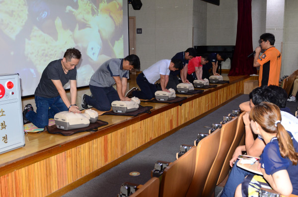 영등포소방서는 지난 4일 오전 문래동 소재 한전KDN에서 직원들을 대상으로 소방안전교육을 실시했다. 사진은 참여자들이 심폐소생술 실습을 하는 모습.(사진제공=영등포소방서)