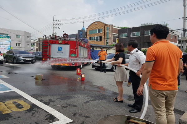 경기 수원시 영통구 매탄2동은 지난 4일 원천119안전센터, 매탄2동대, 행정복지센터 전직원, 매탄2동 주민자치위원 등 30여명이 참여한 가운데 '소방안전 합동훈련'을 실시했다. 사진은 참여자들이 소방호스를 이용해 화재진압 훈련을 하는 모습.(사진제공=영통구청)