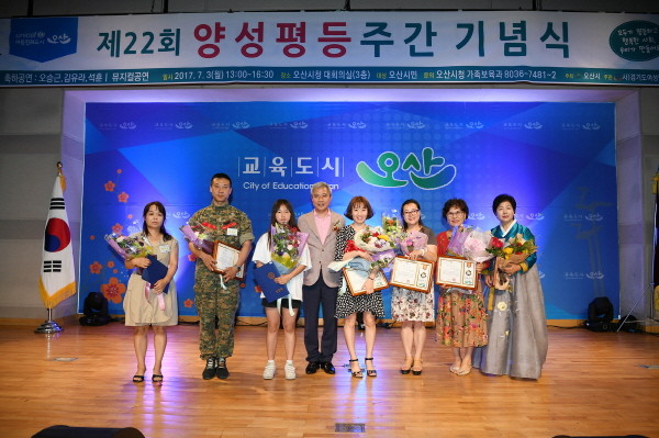 경기 오산시가 지난 3일 시청 대회의실에서 ‘제22회 양성평등주간 기념행사’를 개최했다. 사진은 곽상욱 시장(왼쪽에서 네 번째)이 양성평등 유공자들에게 표창장을 수여한 후 표창 수여자들과 함께 기념촬영을 하는 모습.(사진제공=오산시청)