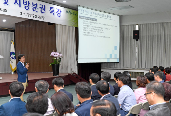 광진구가 지난 5일 오후 3시 구청 대강당에서 직원을 대상으로 ‘정례조례와 지방분권 교육’을 실시했다. 사진은 임승빈 명지대학교 행정학과 교수가 ‘지방분권 출발점은 개헌이다’라는 주제로 강의를 진행하는 모습.(사진제공=광진구청)