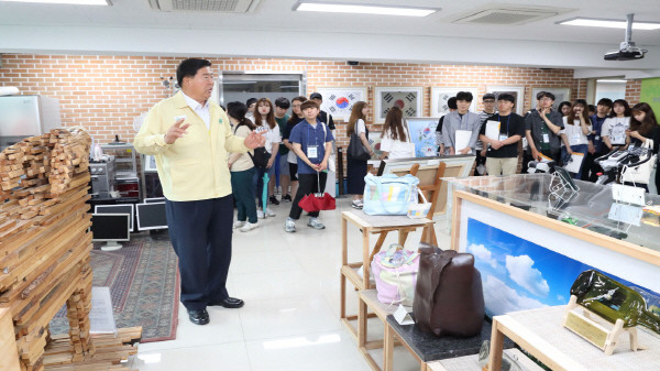 서울 영등포구 대학생 아르바이트 현장체험단은 지난 3일 오후 양평동에 위치한 자원순환센터를 방문했다. 사진은 조길형 구청장(왼쪽)에게 자원순환센터의 시설과 진행되는 재활용사업에 대해 설명을 듣고 있는 체험단원들의 모습.(사진제공=영등포구청)