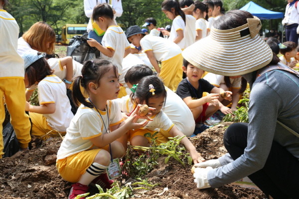 지난 5일 서울 구로구가 오류IC녹지대 도시농업 체험장과 안양천 어린이 자연학습장에서 어린이 감자 수확체험을 진행했다. 사진은 혜원유치원 원아들이 자신이 캠 감자를 보며 질문을 하고있는 모습.(사진제공=혜원유치원)