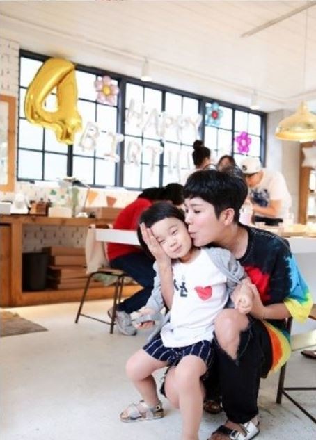 사진 속 김송은 '선'이라는 글자가 적힌 티셔츠를 입고 생일파티에 참석해 아들 선이 귀여운 듯 볼에 뽀뽀를 하고 있다