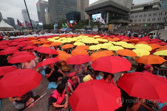8일 오후 서울시 종로구 광화문 광장에서 열린 양심수 석방 촉구 촛불문화제에서 참석자들이 양심수 석방을 촉구하며 우산 퍼포먼스를 하고 있다.