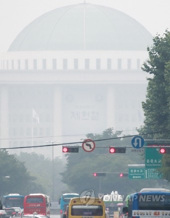 장마가 계속되는 9일 오후 서울 여의도를 오가는 정체된 차량 뒤로 안개에 가려진 국회 모습이 보이고 있다. 추경 상정과 인사청문 후보자 적격 문제로 여야간 갈등이 고조되면서 이번주 국회 정상화가 이뤄질지 주목되고 있다.