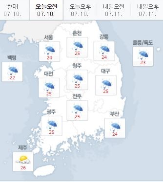 10일 현재 서울은 24도, 춘천 25도, 대전 25도, 청주 25도, 대구 25도, 부산 24도, 광주 25도, 제주 26도를 기록 중이다.