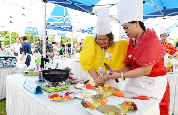 지난 8일 서울 동대문구 용두공원에서 새마을운동 동대문구지회 주최로 ‘제2회 다문화 요리 페스티벌’이 개최됐다. 사진은 페스티벌에 참가한 다문화 주부들이 요리를 만들기 위해 재료 준비를 하는 모습.(사진제공=동대문구청)