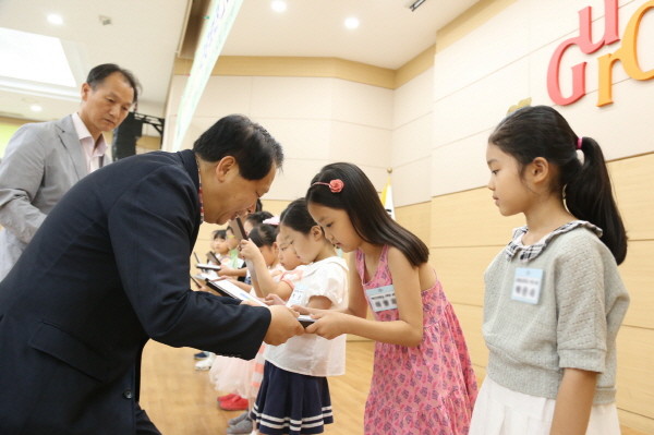 지난 8일 서울 구로구청 강당에서 지난 6월10일 고척근린공원에서 열린 제22회 ‘환경의 날 기념 그림그리기·글짓기 대회’ 시상식을 개최했다. 사진은 이성 구청장이 상장을 전달하고 있는 모습.(사진제공=구로구청)