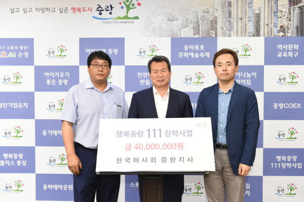 한국마사회 중랑지사는 지난 7일 오후 3시30분 중랑구청장실에서 행복중랑 111 장학기금 4000만원을 기탁했다. 사진은 나진구 구청장(가운데)과 진귀환 한국마사회 중랑지사장(오른쪽) 등이 기념촬영을 하는 모습.(사진제공=중랑구청)