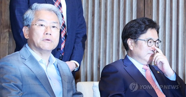 더불어민주당 우원식 원내대표(오른쪽)가 10일 오전 국회 의장접견실에서 열린 국회의장-교섭단체 원내대표 회동에서 국민의당 김동철 원내대표의 발언을 듣고 있다.