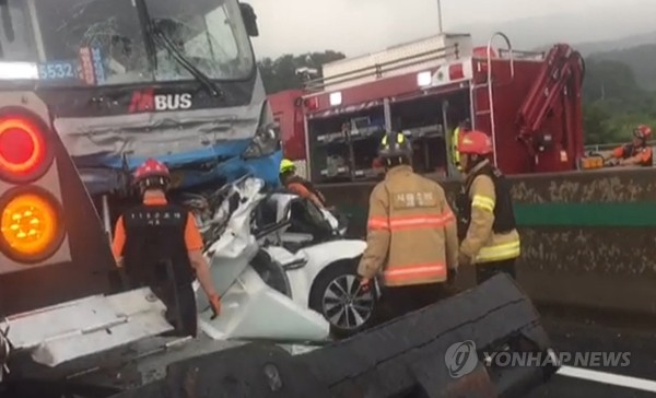 | ▲ 지난 9일 오후 경부고속도로 상행선 신양재 나들목 인근에서 광역버스와 승용차가 추돌하는 사고가 발생해 구조대원들이 부상자 구조 및 사고처리를 하고 있다.(사진제공=연합뉴스) | ||