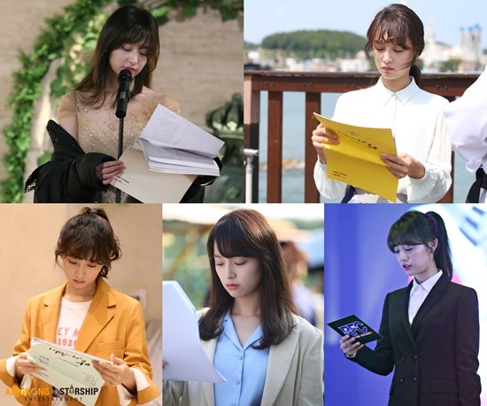 공개된 사진 속 김지원은 진지한 표정으로 대본에 열중하고 있다. 그는 극중에서 금빛 드레스 자태로 우아한 매력을 뽐내던 모습과는 달리, 리허설 중에는 드레스 위에 패딩을 입고 대본을 보고있는 모습이다. 또 다른 사진에서 김지원은 큐카드를 보며 장내 아나운서 멘트를 끊임없이 연습하는 열정적인 면모를 드러냈다.