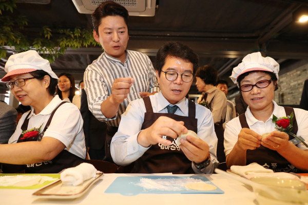 서울 성동구는 11일 오전 언더스텐드에비뉴에서 성동미래일자리주식회사 출범기념 행사로 ‘분식1호점 만두 레시피 시연회’를 개최했다. 사진은 정원오 구청장(오른쪽 두번째) 등 관계자들이 강레오 쉐프(오른쪽 세번째)의 지도를 받아 만두를 빚는 모습.(사진제공=성동구청)