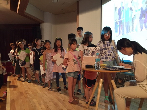 경기 동두천시평생교육원이 지난 8일 초등학생 및 학부모 70여명을 대상으로 <나는 지하철입니다>의 저자인 김효은 작가를 초청해 강연을 진행했다. 사진은 강연 후 김 작가의 사인을 받기 위해 줄을 서고 있는 참가자들의 모습.(사진제공=동두천시평생교육원)