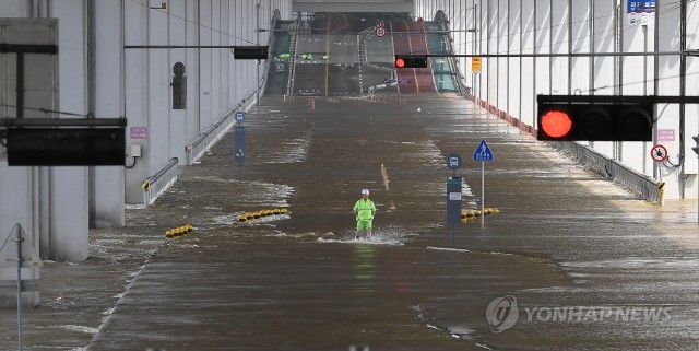 중부지방 호우로 인해 수위 상승으로 팔당댐을 비롯한 한강 수계 댐들이 방류를 하고 있는 11일 오전 서울 잠수교에서 통행 재개 청소를 위해 대기하던 관계자가 출근시간보다 수위가 더 상승하자 물살을 헤치며 빠져 나오고 있다. 잠수교는 오후 늦게나 통행이 가능할 것으로 보인다.