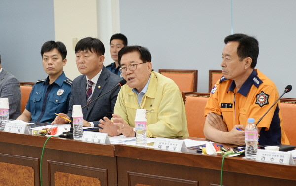 지난 11일 서울 동대문구가 기획상황실에서 ‘전통시장 화재안전협의회 발대식’을 열고 전통시장 화재 안전관리 대책, 협의회 세부 운영방안을 논의 했다. 사진은 유덕열 구청장(오른쪽 두 번째)가 관계자들과 이야기를 나누고 있는 모습.(사진제공=동대문구청)