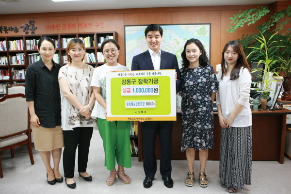 최근 서울 강동구가 문화예술협동조합 ‘아이야’로부터 공연수익금 중 70%에 해당하는 100만원을 장학기금으로 전달했다. 사진은 이해식 구청장(오른쪽에서 세 번째)과 문화예술협동조합 ‘아이야’ 관계자들이 기념촬영을 하고 있는 모습.(사진제공=강동구청)
