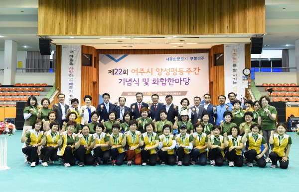 경기 여주시는 최근 양성평등주간을 맞아 여주실내체육관에서 ‘제22회 양성평등주간 기념행사’를 개최했다. 사진은 원경희 시장과 이환설 시의장 등 관계자들이 행사 종료 후 기념촬영을 하는 모습.(사진제공=여주시청)