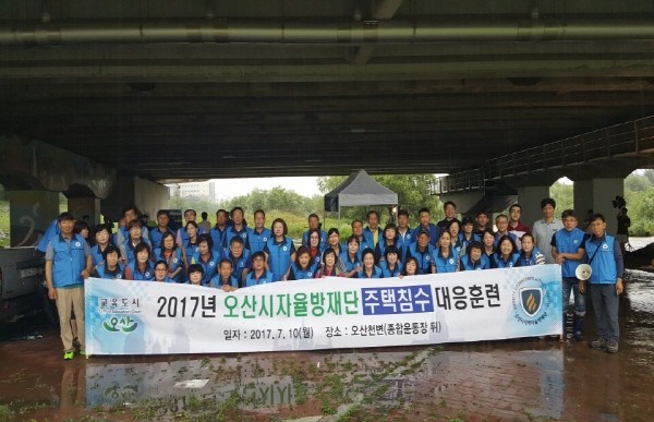 경기 오산시는 지난 10일 오산천변에서 시 자율방재단원들과 함께 집중호우 발생시 재산·인명 피해를 최소화하기 위한 ‘주택침수 대응·복구·구호 모의훈련’을 실시했다. 사진은 훈련 종료 후 관계자들이 기념촬영을 하는 모습.(사진제공=오산시청)