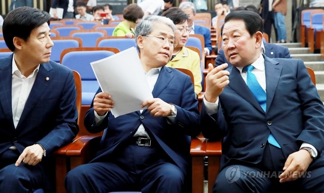 박주선 비상대책위원장(오른쪽) 등 국민의당 지도부가 13일 오후 국회 본청에서 열린 긴급 의원총회에 참석해 논의하고 있다. 오른쪽부터 박 비대위원장, 김동철 원내대표, 이용호 정책위의장.