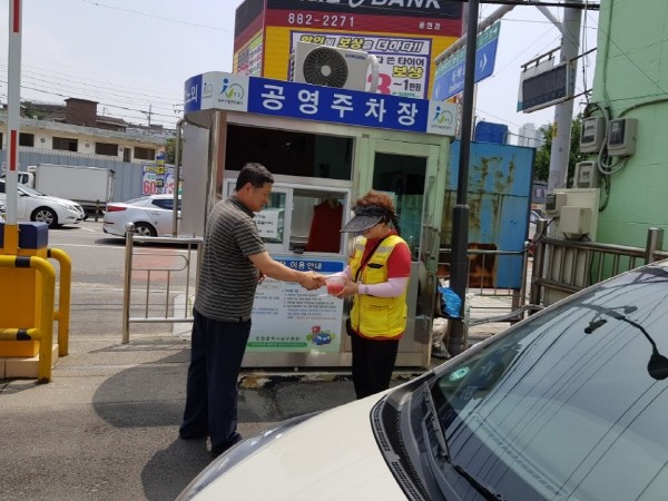 인천 남구시설관리공단은 14일 지역내 주민편의시설에 대한 안전 점검을 실시했다. 사진은 점검 실시 후 공단 관계자가 공영주차장에 근무하는 직원에게 시원한 화채를 전달하는 모습.(사진제공=남구청)