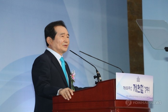 정 의장은 이날 제헌절 69주년을 맞아 열린 경축식에서 “이제 개헌은 검토의 대상이 아닌 국민적 요구이며, 정치권의 의무”라면서 이같이 말하며 ‘국민에 의한 개헌’, ‘미래를 향한 개헌’, ‘열린 개헌’이라는 3대 원칙을 제시했다.