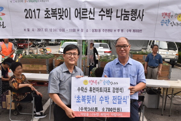 서울 노원구 상계1동은 지난 12일 초복을 맞아 상계1동 주민센터 주차장에서 지역내 케이마트에서 후원받은 수박을 지역 노인들에게 대접하는 행사를 개최했다. 사진은 행사에 앞서 수박을 전달받고 있는 김성환 구청장(왼쪽)의 모습.(사진제공=노원구청)