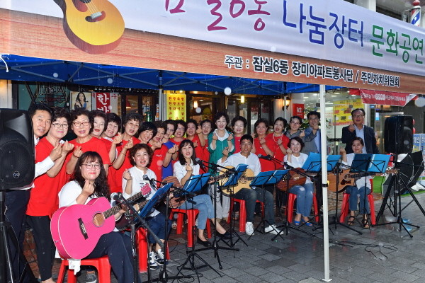 최근 박춘희 서울 송파구청장이 잠실나루역 1층 광장에서 열린 ‘나눔장터 문화공연’에 참석했다. 사진은 인사말 후 공연 참가자들과 함께 기념촬영을 하고 있는 박 구청장의 모습.(사진제공=송파구청)
