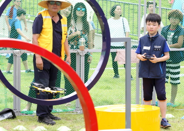 금천구는 지난 14일 청소년들에게 4차 산업혁명 관련 다양한 체험을 제공하기 위해 ‘G-밸리 4차산업 진로체험 페스티벌’을 개최했다. 사진은 페스티벌 드론경진대회에 참여한 학생이 장애물을 피해 드론을 조종하는 모습.(사진제공=금천구청)
