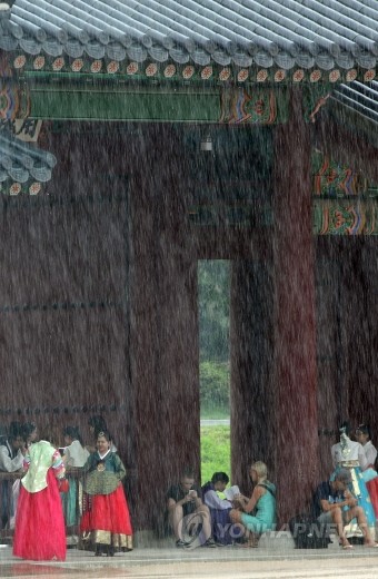 갑작스럽게 많은 양의 소나기가 내린 17일 오후 서울 경복궁에서 관람객들이 처마 밑에서 비를 피하고 있다.