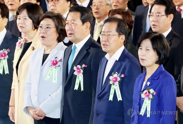 더불어민주당 추미애 대표(오른쪽부터), 자유한국당 홍준표 대표, 국민의당 박주선 비대위원장, 바른정당 이혜훈 대표, 정의당 이정미 대표 등 5당 대표가 17일 오전 국회에서 열린 제69주년 제헌절 경축식에서 애국가를 부르고 있다.