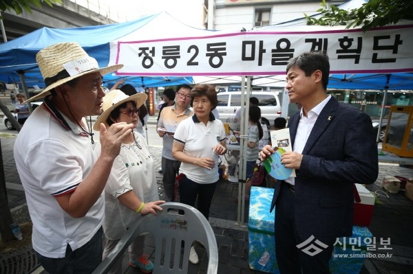 최근 성북구 정릉 입구 교통광장에서 '정릉2동 마을총회'가 열려 10가지 주민 제안사업에 대한 투표를 진행, 마을계획을 주민이 직접 결정하는 마을민주주의 실현의 장이 열렸다. 사진은 김영배 구청장(오른쪽)이 주민들과 이야기를 나누는 모습.