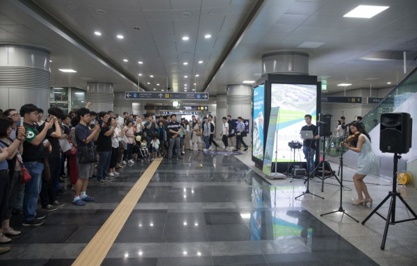 최근 인천 서구 검암역 환승통로에서 바이올린리스트 ‘김빛날윤미’가 참여한 ‘2017 노을마당 문화행사 제3회차 버스킹 공연’이 열렸다. 사진은 통로 한쪽에 서서 공연을 관람 중인 관람객들의 모습.(사진제공=인천서구청)