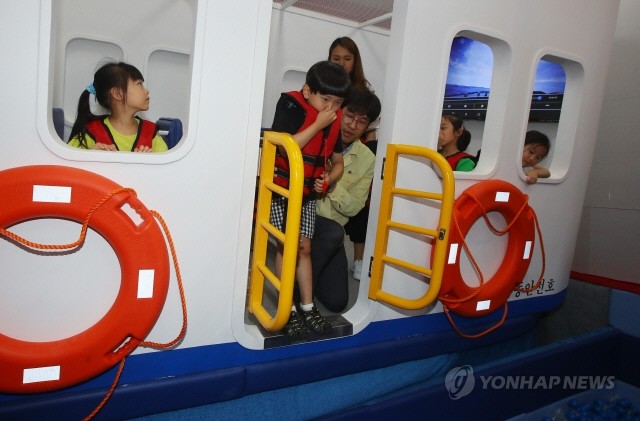 18일 오전 서울 성동구에 개소한 성동생명안전배움터에서 유치원생 어린이들이 해양 사고 상황을 가정해 실제로 기울어지는 체험용 선박에서 탈출 체험을 하고 있다.