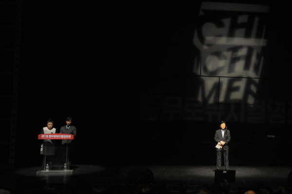 | ▲ 지난해 열린 '제1회 충무로뮤지컬영화제' 개막식에서 사회자들과 최창식 구청장(오른쪽)이 이야기를 나누고 있다. | ||