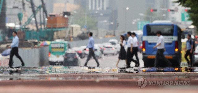 서울 등 전국 대부분 지역에 폭염주의보가 내려진 19일 오후 시민들이 아지랑이가 피어오르는 서울 여의도공원 앞 횡단보도를 건너고 있다.