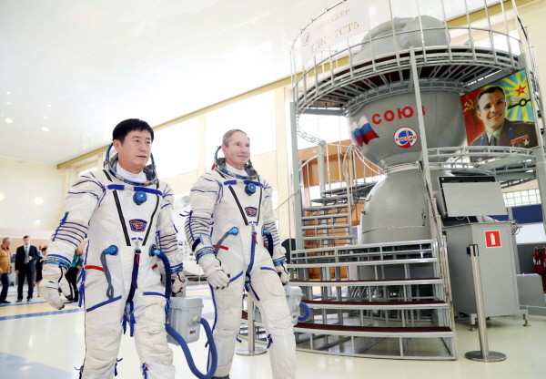 지난 18일 정찬민 경기 용인시장(왼쪽)이 러시아 모스크바 인근의 '스타시티(StarCity)'에서 토카레프 발레리 이바노비치 시장과 우주과학 기술·교육 교류협약을 체결했다. 사진은 정 시장이 이바노비치 시장과 함께 우주복을 입고 스타시티를 둘러보고 있는 모습.(사진제공=용인시청)