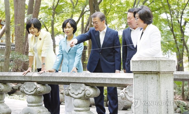 문재인 대통령이 19일 오전 청와대 상춘재에서 정당대표 초청 정상외교 성과설명회를 하기에 앞서 참석한 여야 4당 대표들과 상춘재 뒤뜰을 산책하고 있다. 정의당 이정미 대표(왼쪽부터), 더불어민주당 추미애 대표, 문 대통령, 국민의당 박주선 비상대책위원장, 바른정당 이혜훈 대표.