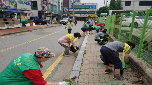 경기 하남시 신장2동 행정복지센터는 지난 19일 통장단 등 유관단체 회원 120여명과 함께 '클린데이' 행사를 진행했다. 사진은 참여자들이 동 청사 주변 잡초 제거와 인근 주택가의 쓰레기를 수거하는 모습.(사진제공=하남시청)