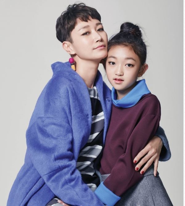 변정수는 딸과 함께 한 여성지와의 화보에서 블루컬러 재킷과 스트라이프 원피스를 입고 카메라를 바라보고 있다.
