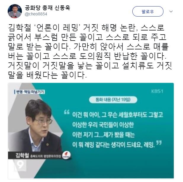 공화당 신동욱 총재가 김학철 충북도의원의 '레밍 발언' 전화통화 녹취록에 일침을 가했다.