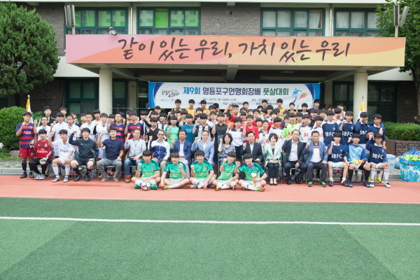 최근 이용주 서울 영등포구의장을 비롯한 의원들은 지역내 선유중학교에서 열린 ‘제9회 영등포구연맹회장배 풋살 대회’ 개회식에 참석했다. 사진은 이 의장과 의원들을 비롯한 풋살대회 관계자 및 선수 등이 기념촬영을 하는 모습.(사진제공=영등포구의회)