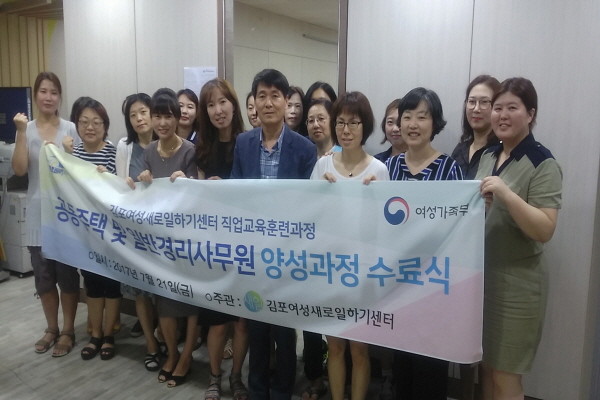 경기 김포시 여성새로일하기센터는 최근 공동주택 사무원에 대한 수요가 급격하게 증가하고 있는 지역 실정에 발맞춰 추진하고 있는 ‘공동주택 및 일반경리사무원 양성과정’의 수료식을 개최했다.(사진제공=김포시청)