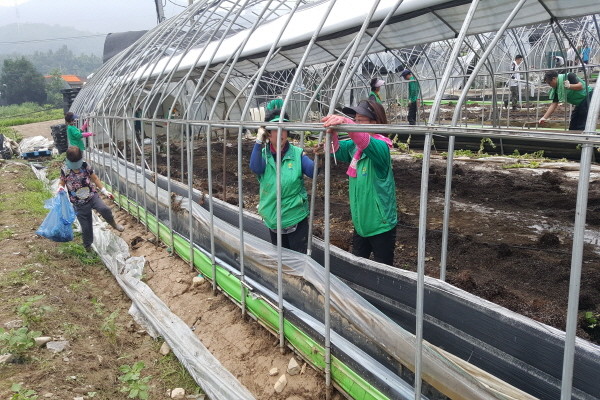 새마을운동 양주시지회는 지난 24일 새마을 지회장을 비롯한 새마을 회원 40여명으로 봉사단을 구성해, 수해 피해를 겪은 청주시 상당구 남일면 지역을 찾아 수해복구 작업을 펼쳤다. 사진은 참여자들이 비닐하우스를 수리하는 모습.(사진제공=양주시청)