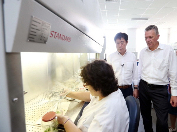 지난 24일 정찬민 경기 용인시장이 루마니아 피테슈티시에 있는 종자연구소에서 농가의 새로운 고부가가치를 창출하기 위한 '과수육종 산업 교류협력 양해각서(MOU)'를 체결했다. 사진은 정 시장과 미하일코만 소장이 루마니아 종자연구소를 둘러보는 모습.(사진제공=용인시청)