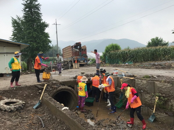 지난 24일 경기 양평군자원봉사센터 회원 50여명은 이례적인 호우로 피해를 입은 충북 청주시 미원면 지역의 '수해 복구 봉사활동'을 실시했다. 사진은 개천의 토사를 제거하고 있는 봉사자들의 모습.(사진제공=양평군청)