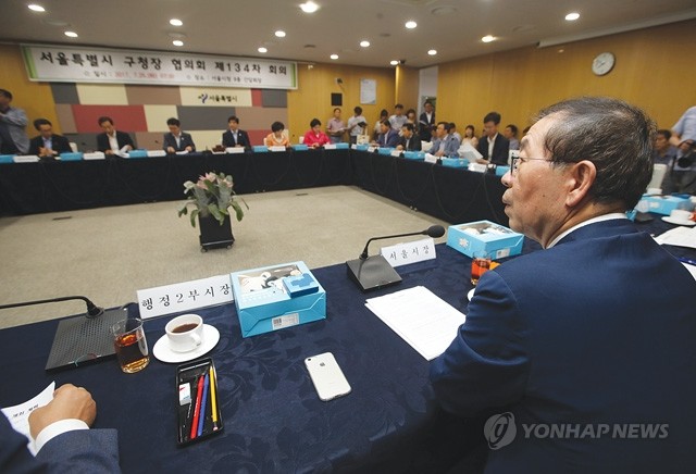 25일 오전 서울시청에서 열린 서울시 구청장협의회 회의에 박원순 시장이 참석해 발언을 듣고 있다.