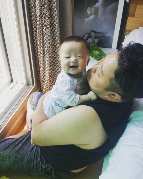 공개된 사진 속 그는 아들을 품에 안고 아들을 바라보고 있으며 아들은 카메라를 응시하며 웃고 있는 모습이다.