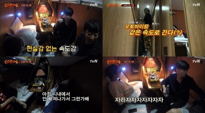 25일 방송된 tvN 예능프로그램 '신서유기 4'에서 멤버들이 사파로 향하는 기차에 타게됐다. 멤버들은 들뜬 마음을 감추지 못했다. 이때 이수근은 기차 옆에서 지나가는 스쿠터를 보게 됐다. 옆에 있던 스쿠터는 기차보다 속도를 더 빨리 달리고 있는 아이러니한 상황.